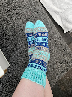 Ensimmäiset sukat neuloin Novitan yksivärisillä langoilla: turkoosia, sinistä, harmaata, valkoista, mustaa ja ruskean sekä viininpunaisen kerän lopusta.